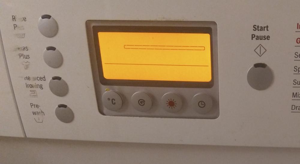 I've looked at your common faults document, as well as everything I can find online to answer this question. I returned home to discover the wash/dry had stopped, it was stuck on about 58 minutes drying left. I turned to zero, waited for the door to unlock, and removed the laundry. I didn't think too much more of it. I loaded the machine for another wash tonight, turned the knob - and it just shows the LCD timer bar, nothing else. No buttons seem to do anything. I've tried all the online solution suggestions I can find including turning to 1 o'clock and holding power, turning to 6 o'clock and holding timer, then to 7 o'clock and holding timer (doing this for all buttons in fact). Nothing changes. I just still get the LCD timer bar. If I turn the knob back to zero, the display goes off. To any other position, the timer bar. I've tried disconnecting the power for 5 minutes, and for 45 minutes. Still the same. This isn't the childlock key problem. I've attached a screenshot Any ideas? Thanks!