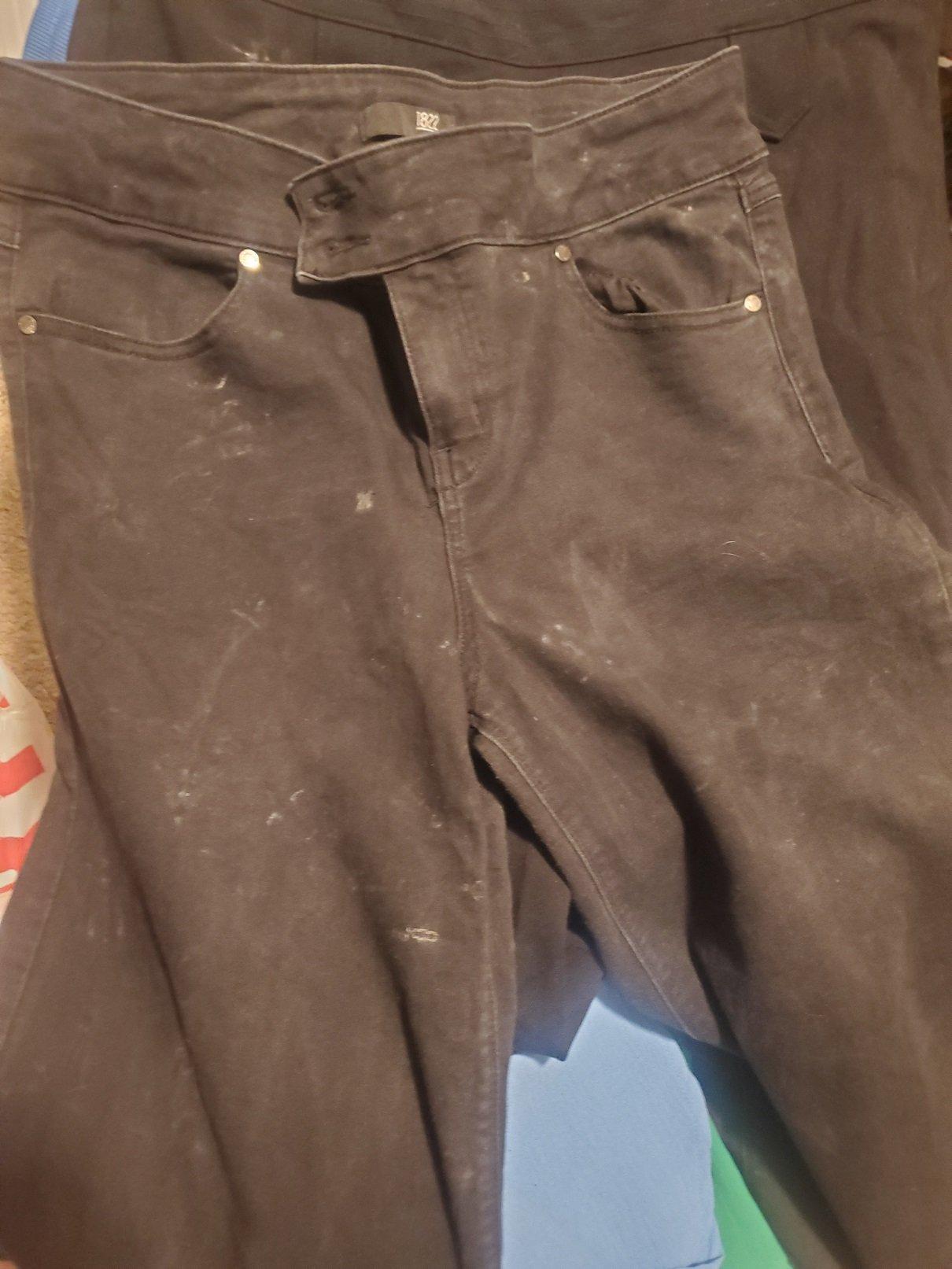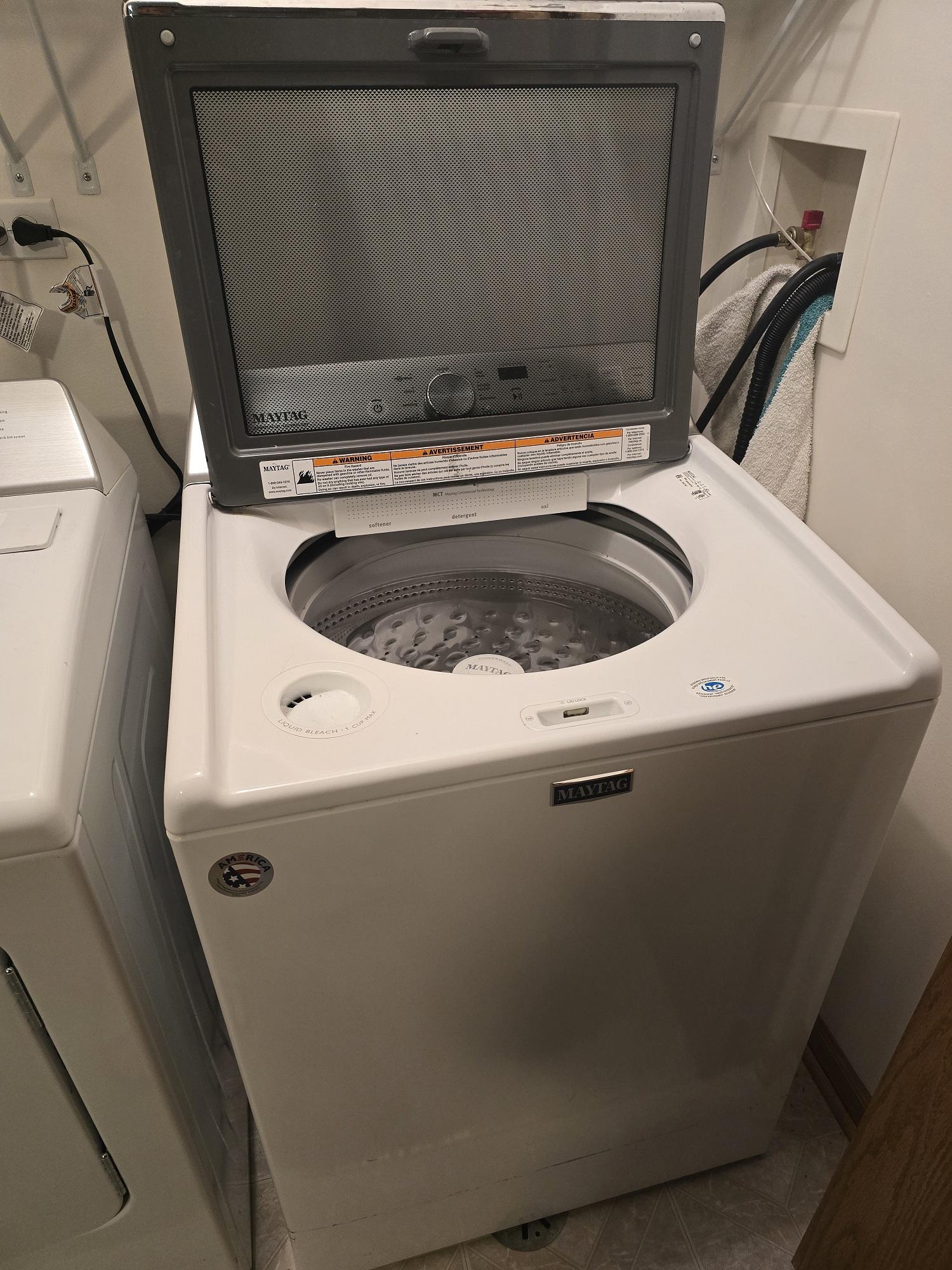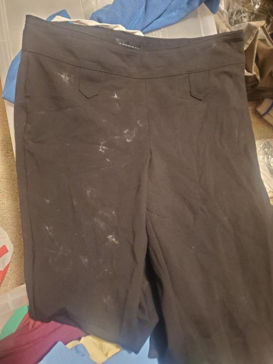 I leave in a town house and there is a Maytag washing machine. The washing machine leaves stains on any clothes (see attached images). This is most noticeable on dark clothes such as black and red. I opened the top of the machine, cleaned out as much of the grime on top of the drum as I could and then found a thick layer of disgusting built-up grime on the outside of the drum. I put a towel behind the drum and spined it until the towel turned black (see attached videos and images). I washed the towel and repeated this over 20 times. In the attached video you can see the gunk coming out through the holes in the drum of the washing machine. The towel pushed all the grime inside (see videos here and here). I repeated the process until there was apparently no grime left on the towel or in those holes. There seems to be no grime now, at least on the outside of the drum. After that, I used 2 liters (a cup at a time) in the "liquid bleach" dispenser and inside the drum itself, one cycle after another for several hours straight, and used the "clean washer" cycle several times after that. But it doesn't seem to have helped, all the clothes are still stained. I think even though I cleaned outside the drum, there is still build-up grime underneath the drum. I tried changing the detergent (even though I used the same one for 10 years in other apartments I lived in), using different cycles, cleaning the machine, etc, but nothing helped. What can be my next steps to figure out the issue before asking the landlord to replace the washing machine? BTW, when I moved into this house, the washer and dryer were extremely dirty and covered in sticky grime. washing_machine_2.mp4