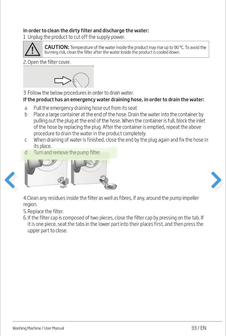 Root Admin Whitegoodshelp Posted May 18, 2022 Root Admin Posted May 18, 2022 Just looking at the last instructions in the manual page you posted. (No 6). Not sure what it’s on about, does the part that you turn to try to open it pull or push in? If there is any paper in the pump filter it may well block it. If the washer is pumping out ok and you can’t get the pump filter out then you can just keep using the washing machine. You just may need to get an engineer in if you subsequently need to clean the filter. Need a repair or spare parts? Book a Repair | Spares4Appliances WARNING: Read this before attempting any diy repairs. No representations or warranties are made (express or implied) as to the reliability, accuracy or completeness of advice. I can't be held liable for any loss arising directly or indirectly from the use of, or any action taken in reliance on, any information on this website, which is given free of charge and in good faith.